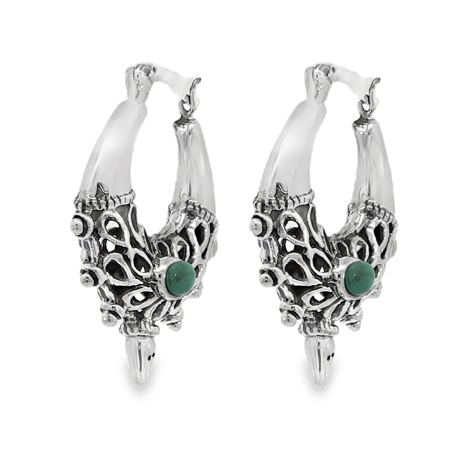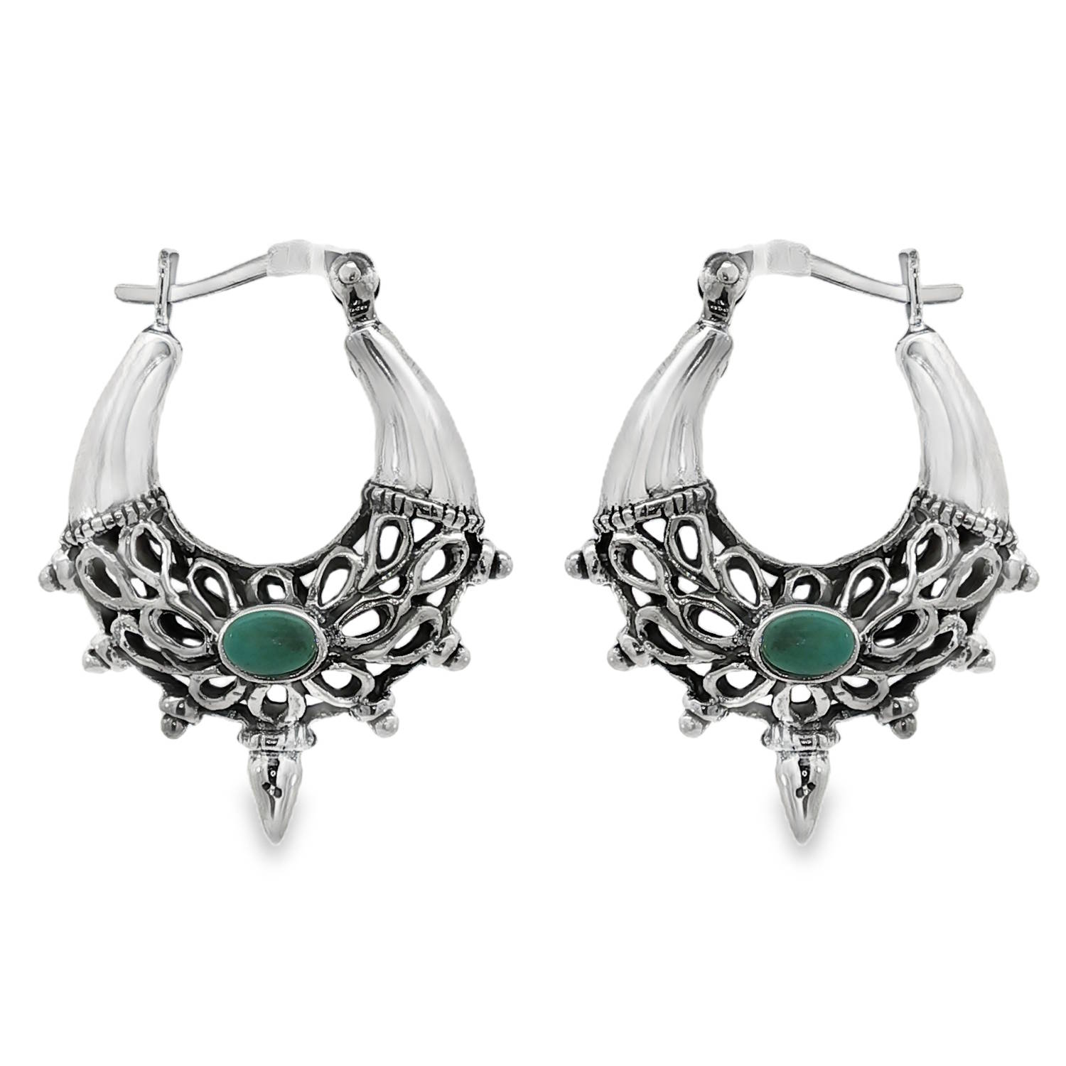Sublimes boucles d'oreilles créoles en argent 925/000 ornées d'une turquoise. Ces boucles d'oreilles, au design raffiné, présentent une turquoise ronde taillée en cabochon, d'une couleur bleu-vert envoûtante. Le travail d'argent est complexe, ajoutant une touche d'élégance et de mystère. Parfaites pour compléter une tenue bohème chic.