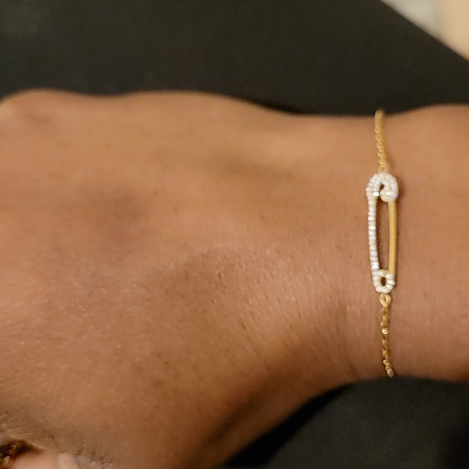 Le design innovant de l'épingle à nourrice, délicatement ornée de strass incolores à taille brillant, apporte une touche d'éclat subtile et raffinée.