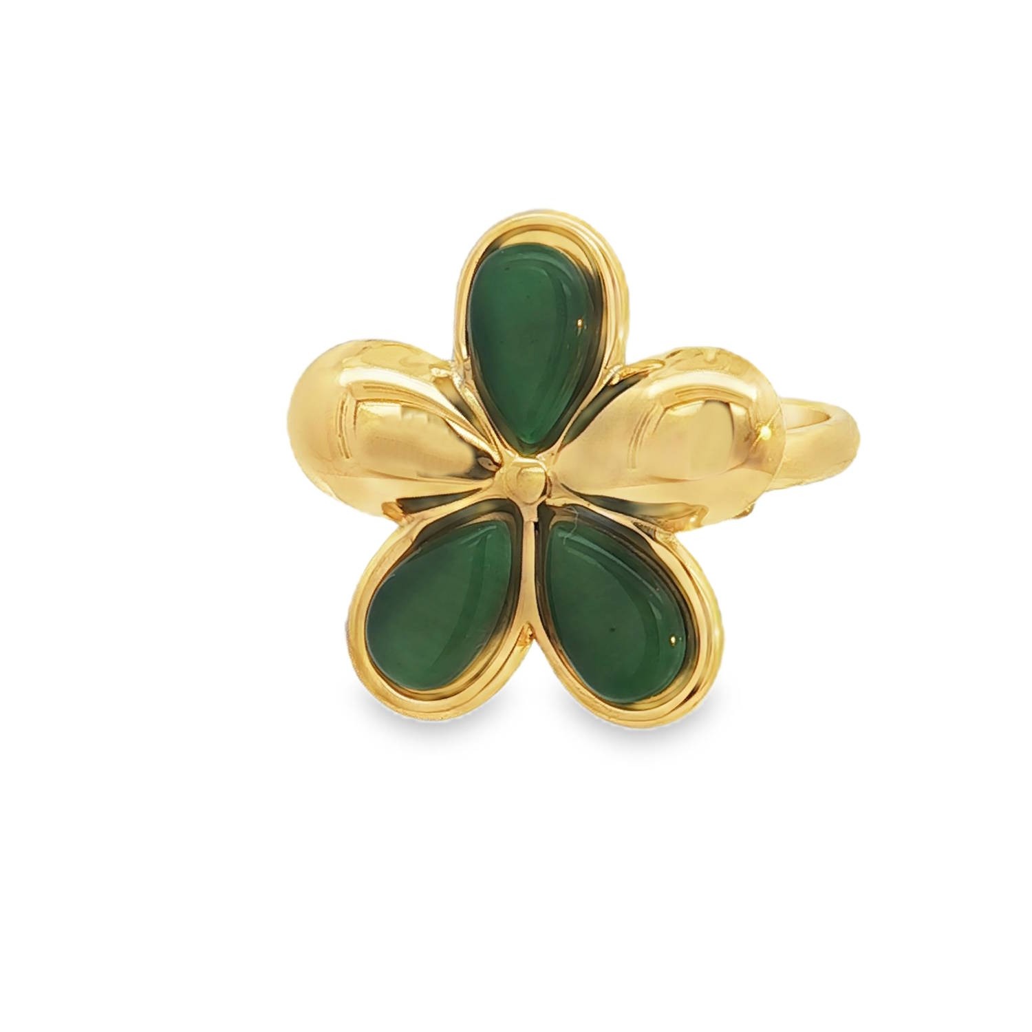 Description Sublime bague cocktail en métal doré, ornée d'une fascinante fleur sertie de cymophane. Le cymophane, taillée en cabochon, présente une couleur verte éclatante et une surface lisse. Un bijou d'exception, symbole d'élégance et de raffinement, parfait pour illuminer vos soirées. Taille ajustable. Cliquez sur une matière, un thème, une couleur ou une collection pour voir tous les articles associés.