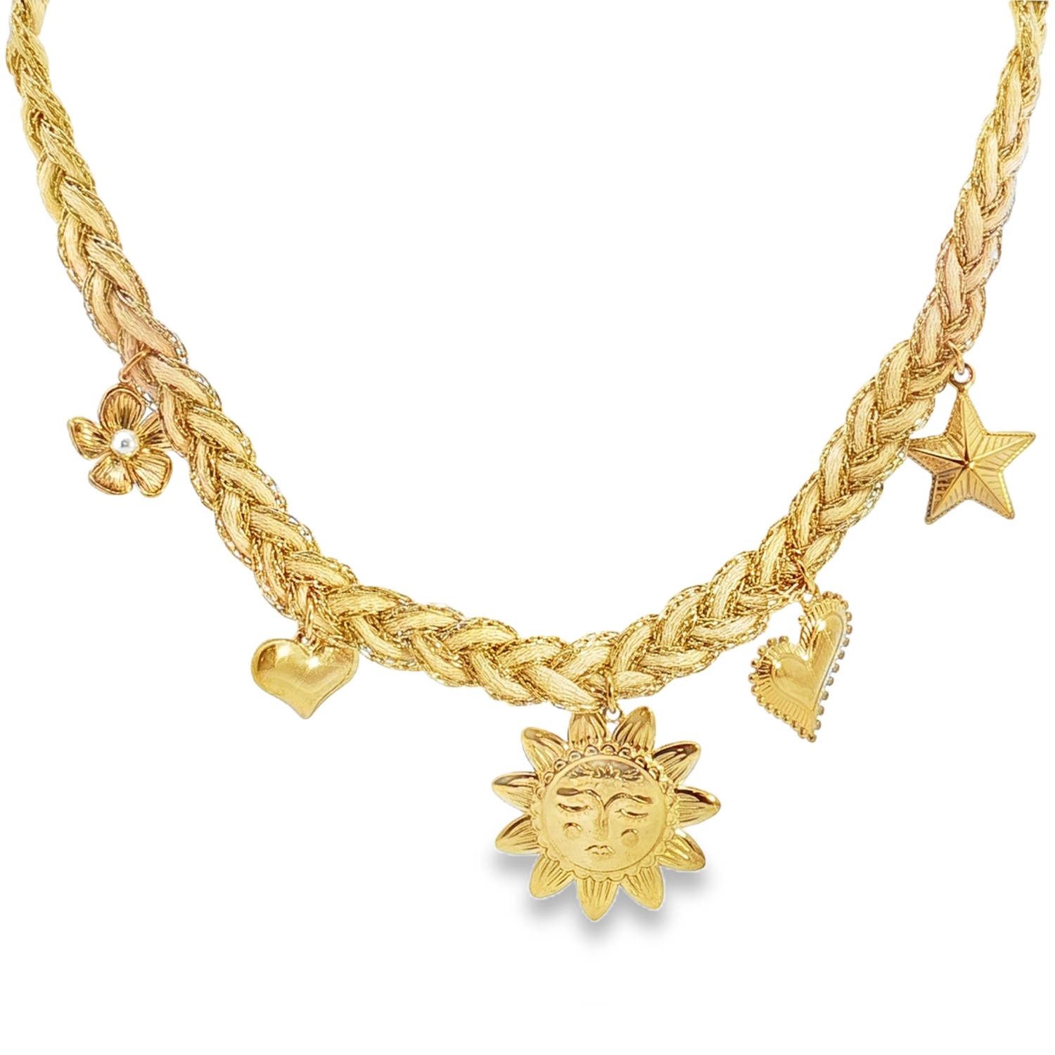 Exprimez votre individualité avec ce collier à breloques en acier doré et un cordon tressé de fils dorés. Un amalgame parfait d'artisanat délicat et d'esthétique ludique. Idéal pour rehausser votre style quotidien ou ajouter une touche d'éclat à une tenue de soirée. Ce collier reflète un design éclectique pour une femme qui ose être elle-même. Fermoir mousqueton avec 5 cm de rallonge.