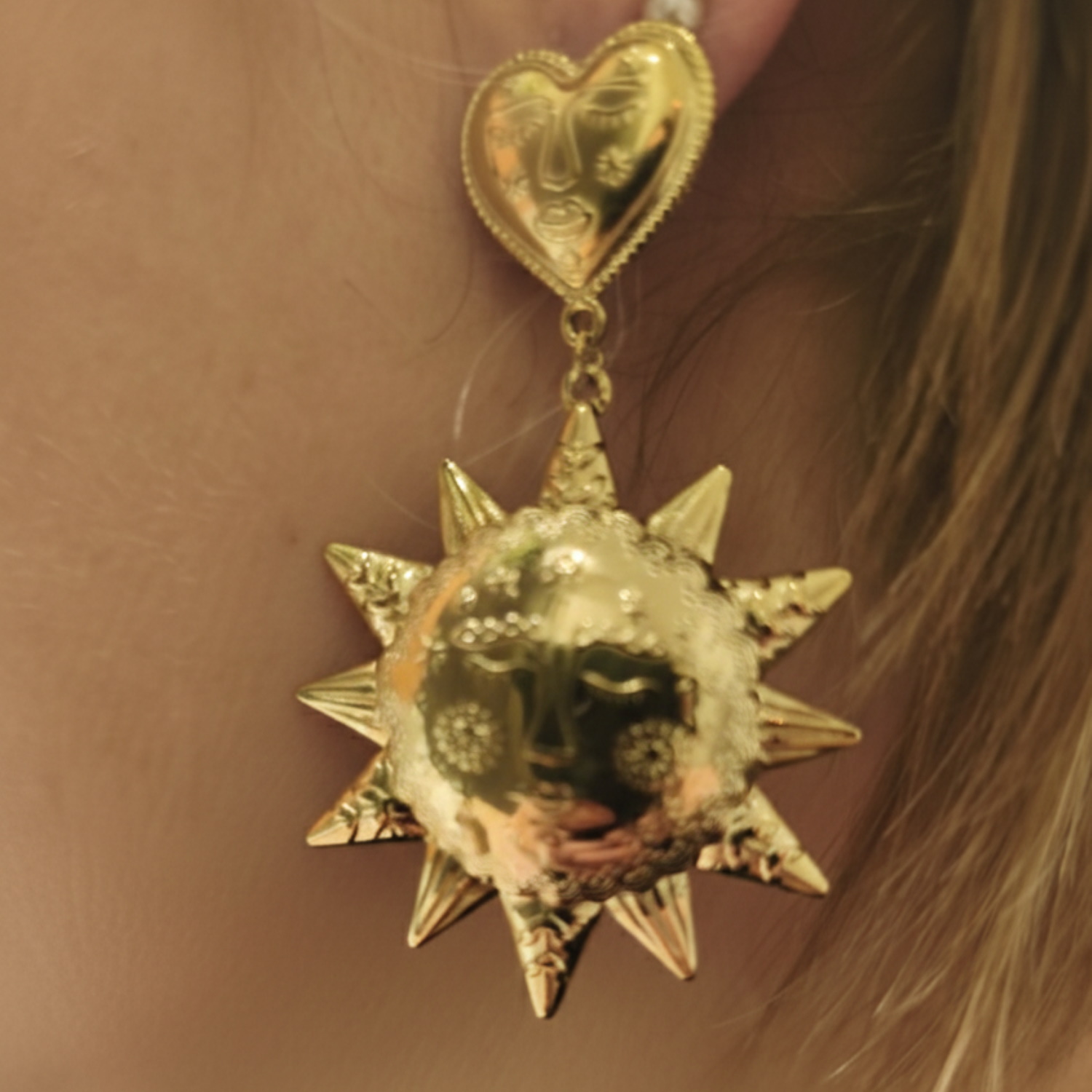 Description Sublimez votre style avec ces boucles d'oreilles pendantes dorées. L'alliage en acier doré finement ouvragé met en valeur un motif céleste original. L'ornementation délicate et le design artistique font de ces boucles d'oreilles un accessoire incontournable pour une touche d'éclat. Largeur 38 mm Hauteur 62 mm Matière(s) Acier . L'acier utilisé dans la bijouterie existe sous plusieurs qualités. Nous utilisons principalement la qualité 316L, qualité qui est utilisée en chirurgie. Cet acier est donc inoxydable et reste très résistant. Fermoir Tiges poussettes Couleur(s) dominante(s) Doré Public Adolescent , Adulte . Genre Femme , Fille . Saison Indémodable . Thème(s) Amour , Nature . Cliquez sur une matière, un thème, une couleur ou une collection pour voir tous les articles associés.