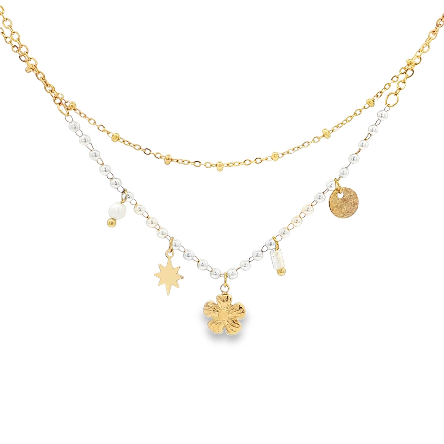 Embellissez votre décolleté avec ce délicat collier multicouche en acier doré.<br/>Des perles nacrées parfaitement rondes et polies agrémentent le niveau inférieur, mettant en valeur des breloques raffinées.<br/>Un bijou féminin qui apporte une touche d'élégance subtile à toute tenue.<br/>Fermoir mousqueton avec 5 cm de rallonge. Etoile Multirangs Perle  Adolescent Adulte Femme Fille Fleurs Indémodable Nature Embellissez votre décolleté avec ce délicat collier multicouche en acier doré.<br/>Des perles nacrées parfaitement rondes et polies agrémentent le niveau inférieur, mettant en valeur des breloques raffinées.<br/>Un bijou féminin qui apporte une touche d'élégance subtile à toute tenue.<br/>Fermoir mousqueton avec 5 cm de rallonge. Etoile Multirangs Perle  Adolescent Adulte Femme Fille Fleurs Indémodable Nature