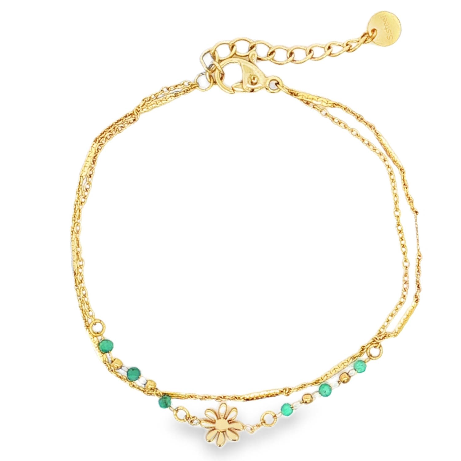 Sublime bracelet double rangs chaîne en acier doré, rehaussé de délicates perles turquoises et d'un motif floral ajouré.<br/>Ce bijou raffiné, ajustable grâce à sa chaînette, apportera une touche d'éclat discret à votre poignet.<br/>Un accessoire précieux pour sublimer votre style.<br/>Fermoir mousqueton avec 3 cm de rallonge. Multirangs Perle  Adolescent Adulte Femme Fille Fleurs Indémodable Nature