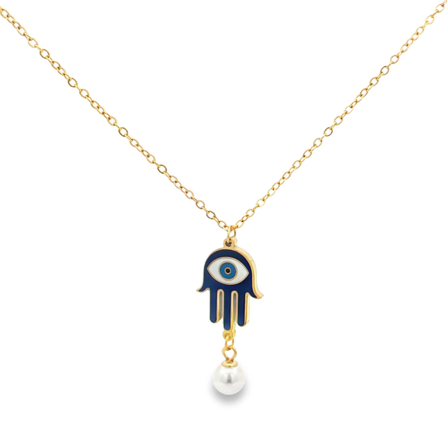 Le pendentif présente une main de Fatma stylisée avec un œil protecteur, suspendu à une perle ronde au lustre doux.