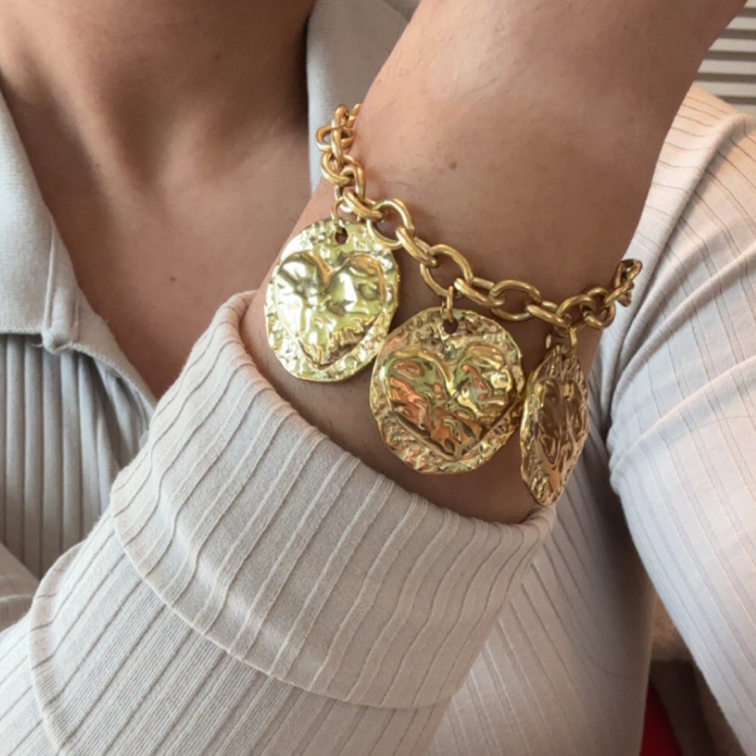 Description Rehaussez votre collection de bijoux avec ce bracelet à chaîne en acier doré. Son design élégant est ponctué de trois breloques circulaires ornées de motifs en forme de cœur texturés, offrant une touche romantique et raffinée à votre style. Un accessoire parfait pour exprimer votre amour de la mode. Fermoir mousqueton avec 3 cm de rallonge. Longueur 16+3 cm [Guide des tailles] Largeur 30 mm Matière(s) Acier . L'acier utilisé dans la bijouterie existe sous plusieurs qualités. Nous utilisons principalement la qualité 316L, qualité qui est utilisée en chirurgie. Cet acier est donc inoxydable et reste très résistant. Fermoir Mousqueton Couleur(s) dominante(s) Doré Public Adolescent , Adulte . Genre Femme , Fille . Saison Indémodable . Thème(s) Amour . Cliquez sur une matière, un thème, une couleur ou une collection pour voir tous les articles associés.