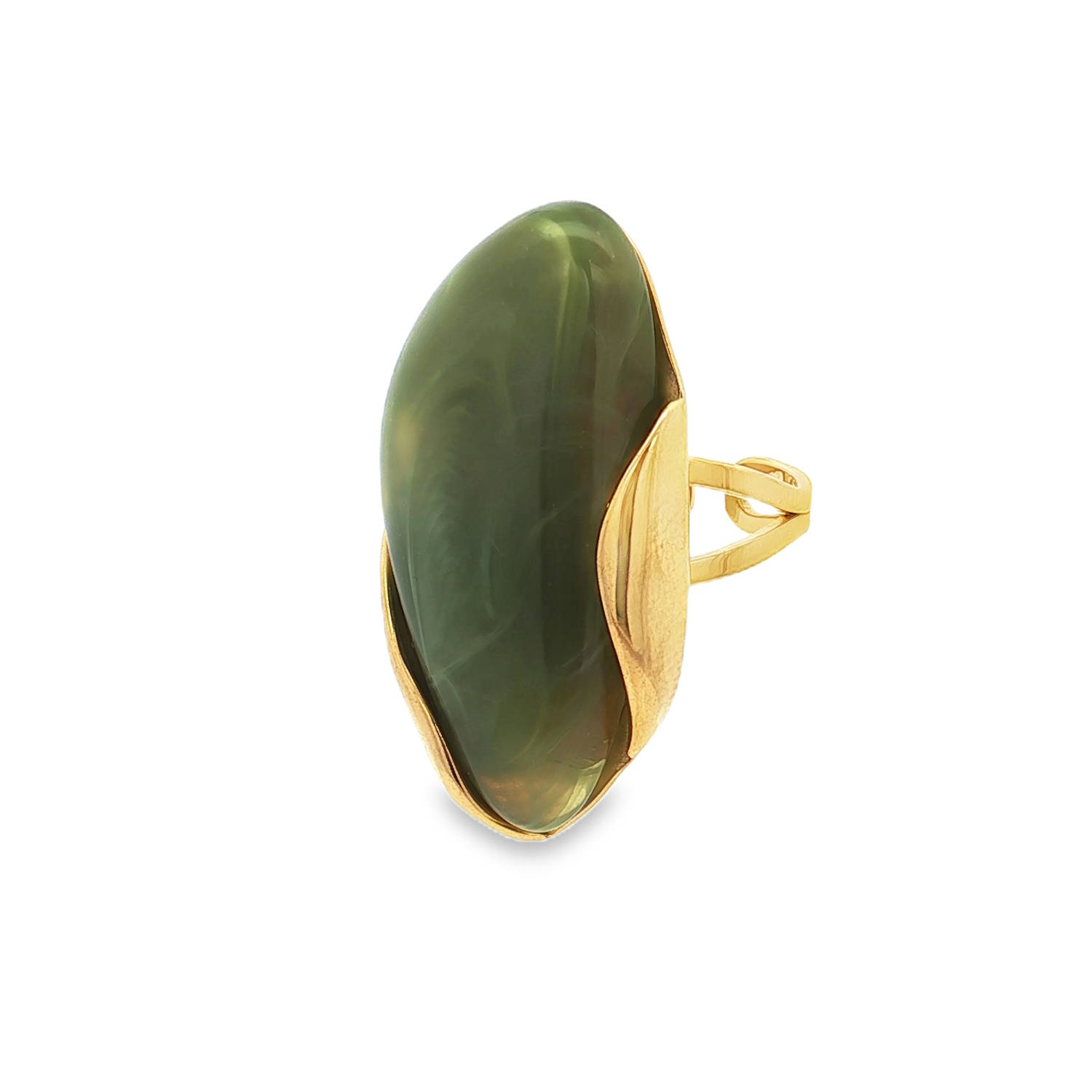 Découvrez cette bague cocktail audacieuse en acier doré, ornée d'une pierre cabochon captivante.<br/>Le poli de la pierre met en valeur ses motifs uniques, tandis que la monture en acier doré rehausse son charme intemporel.<br/>Une pièce de caractère qui ne manquera pas d'attirer les regards et d'ajouter une touche d'originalité à votre style.<br/>Taille ajustable.  Adolescent Adulte Femme Fille Indémodable