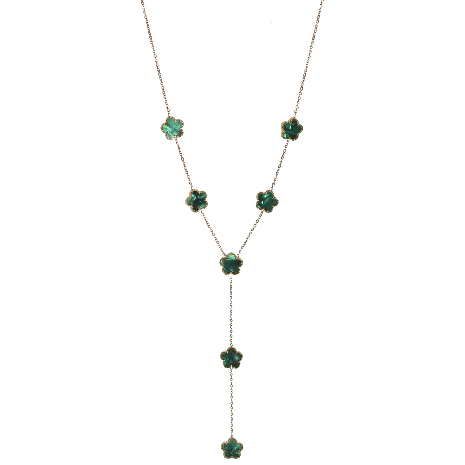 Description Collier sautoir de forme Y en acier doré et fleurs serties d'une pierre verte. Cliquez sur une matière, un thème, une couleur ou une collection pour voir tous les articles associés.