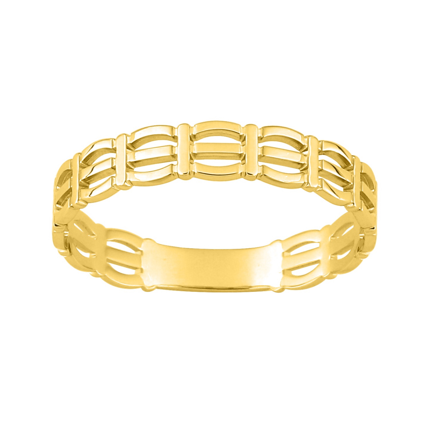 Description Bague anneau avec motifs ajourés en plaqué or jaune 18 carats. Largeur 4 mm Matière(s) Plaqué or . Nos bijoux en plaqué or sont faits sur une base de laiton et recouverts d'or 18 carats à 3 microns sans dispersion. Cela signifie que nous garantissons 3 microns d'or sur n'importe quelle partie du bijou. Sur la plupart de nos bijoux empierrés, nous montons à 5 microns d'or 18 carats. Pour finir, nous faisons également une finition avec de l'or 24 carats afin de donner un plus bel éclat à nos bijoux. Couleur(s) dominante(s) Doré Public Adolescent , Adulte . Genre Femme , Fille . Saison Indémodable . Cliquez sur une matière, un thème, une couleur ou une collection pour voir tous les articles associés.