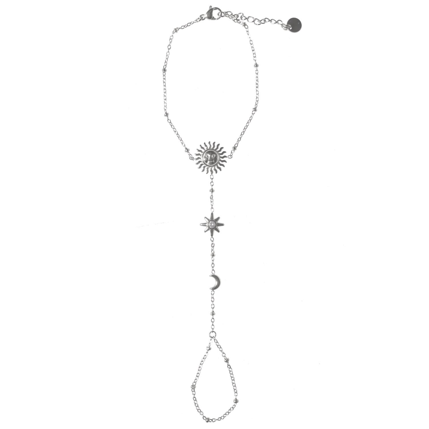 Description Bracelet de main composé d'une chaîne avec motifs de soleil et croissant de lune en acier argenté et d'une étoile ornée d'un cristau serti clos. Fermoir mousqueton avec 3 cm de rallonge. Longueur 16+3 cm [Guide des tailles] Largeur 10 mm Matière(s) Acier , Verre . L'acier utilisé dans la bijouterie existe sous plusieurs qualités. Nous utilisons principalement la qualité 316L, qualité qui est utilisée en chirurgie. Cet acier est donc inoxydable et reste très résistant. Fermoir Mousqueton Couleur(s) dominante(s) Argenté Public Adolescent , Adulte . Genre Femme , Fille . Saison Indémodable . Thème(s) Nature . Cliquez sur une matière, un thème, une couleur ou une collection pour voir tous les articles associés.