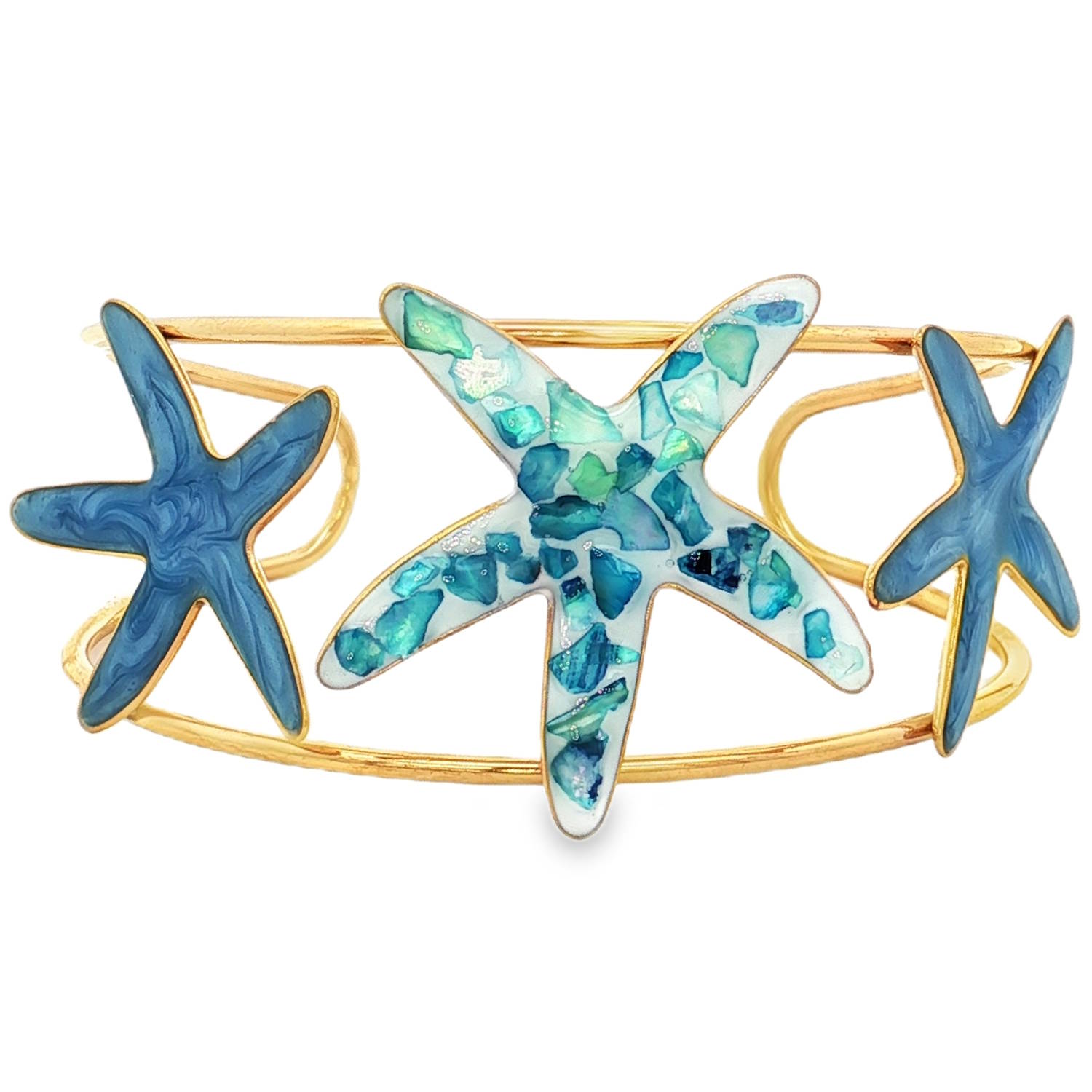 Une étoile de mer majestueuse ornée d'une marqueterie de nacre dans un dégradé de bleu ciel et de vert émeraude. Deux étoiles de mer plus petites encadrent la pièce centrale. Elles arborent une finition en émail bleu azur avec des effets de marbrures rappelant le mouvement des vagues.