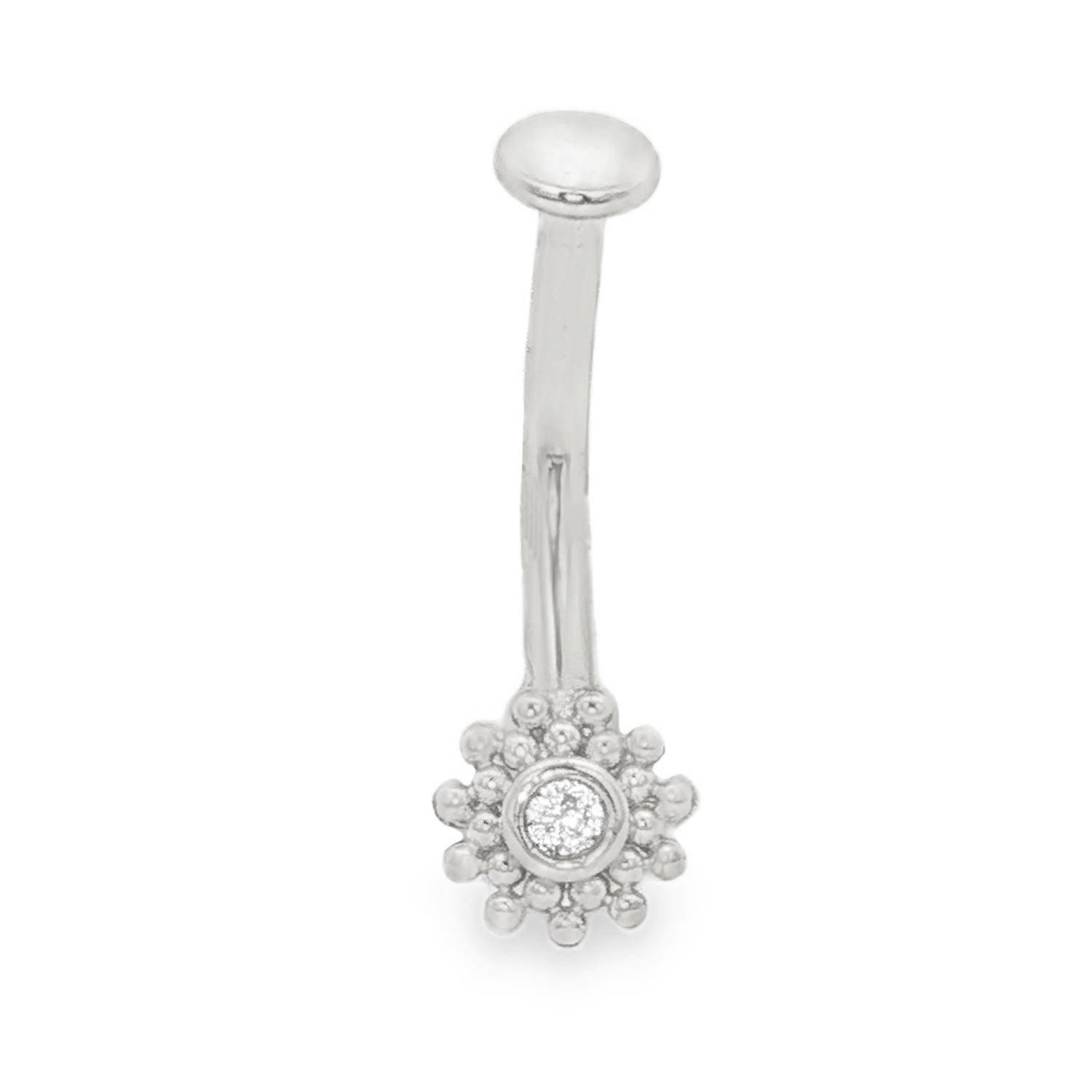 Ce piercing pour le nombril combine élégance classique et détails d'inspiration bohème-chic. Conçu avec une barre courbée en acier chirurgical 316L, il met en avant un motif floral délicat et finement travaillé.