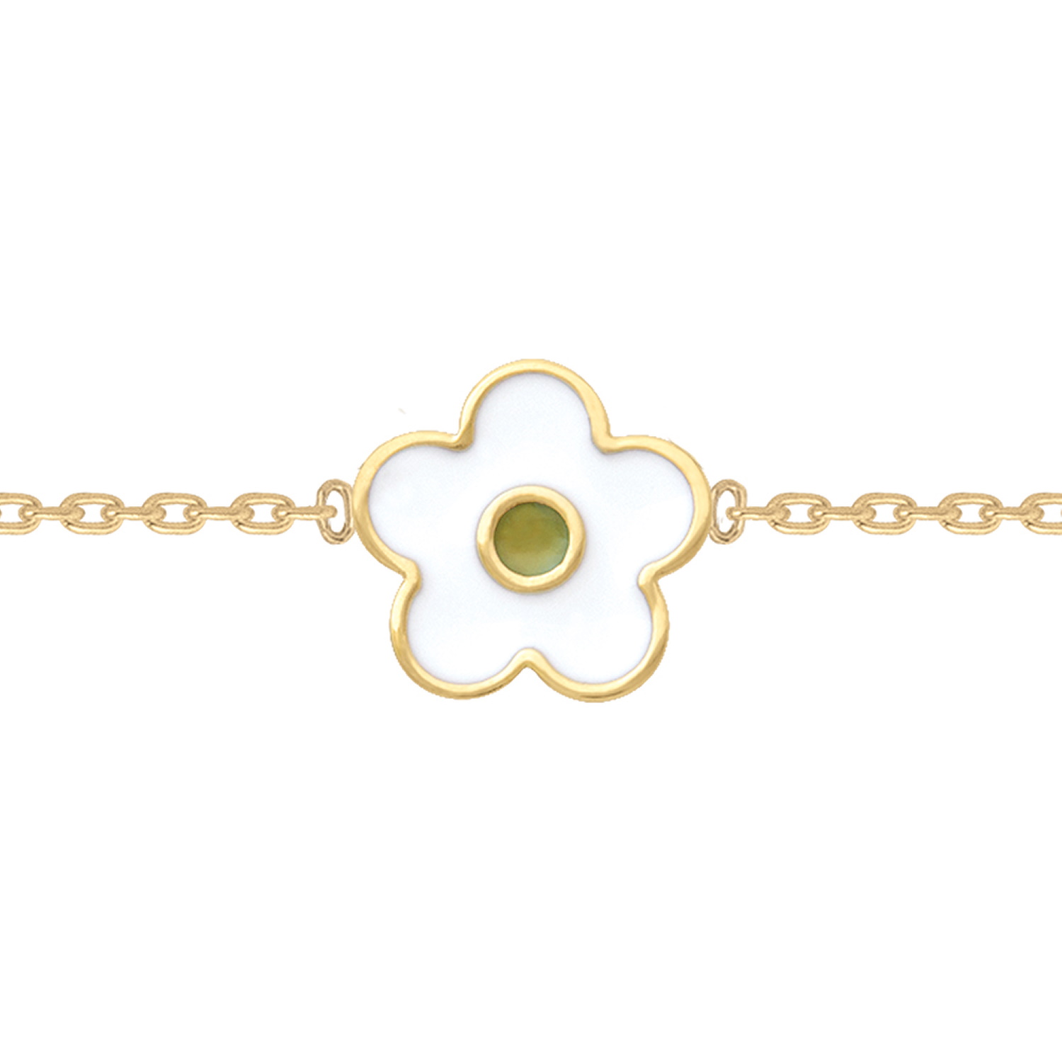 Bracelet composé d'une chaîne en plaqué or jaune 18 carats et d'une fleur pavée d'émail blanc.