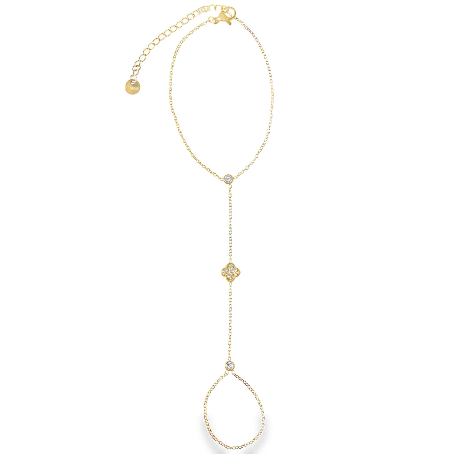 Sublimez votre gestuelle avec ce bracelet de main raffiné en acier inoxydable doré. Alliant la finesse d'une chaîne maille forçat à l'élégance d'un motif trèfle serti de cristaux, ce bijou habille délicatement le dos de la main jusqu'au doigt.