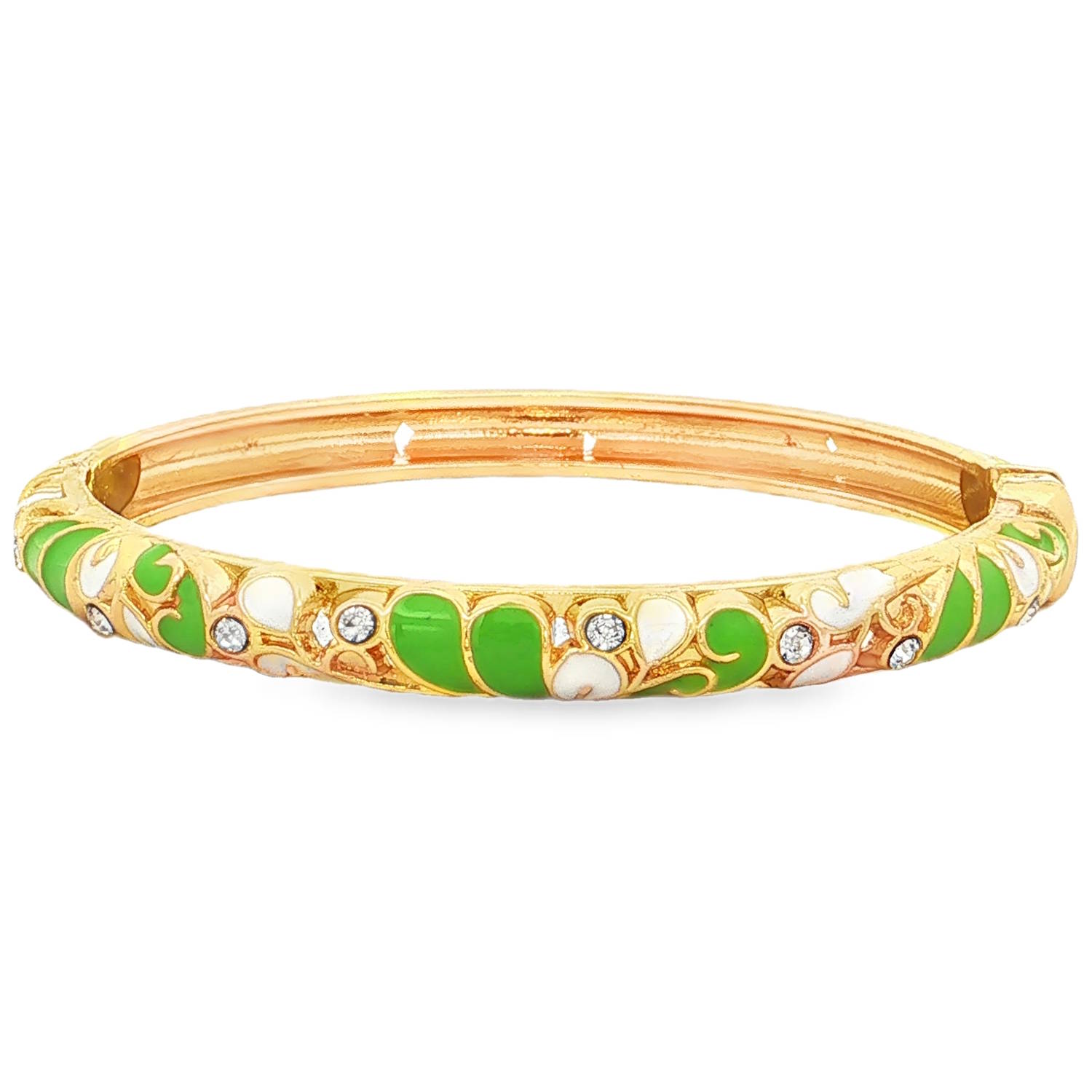 La surface est délicatement ornée d'émaux aux teintes vert pomme et blanc nacré. Ces touches de couleur sont disposées en motifs de feuilles ou de pétales, apportant un contraste vif avec le métal doré.