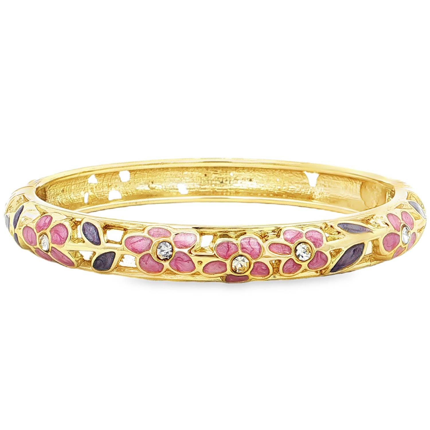 Ce bracelet est un jonc élégant et printanier, alliant la brillance du métal à la délicatesse de motifs floraux.<br/>Le tour du bracelet est orné d'une succession de petites fleurs émaillées. Les pétales sont déclinés dans des nuances de rose nacré, créant un relief doux et féminin.<br/>On observe également de petites feuilles émaillées dans des tons violet prune et lavande, qui contrastent élégamment avec le rose des fleurs.<br/>Le cœur de chaque fleur est serti d'un petit cristal scintillant incolore, apportant une touche de lumière et de raffinement à l'ensemble.<br/>Système de charnière discret permettant d'enfiler et de retirer le bijou avec facilité tout en assurant un maintien sécurisé au poignet. Jonc Rigide Strass  Adolescent Adulte Femme Fille Fleurs Indémodable Nature