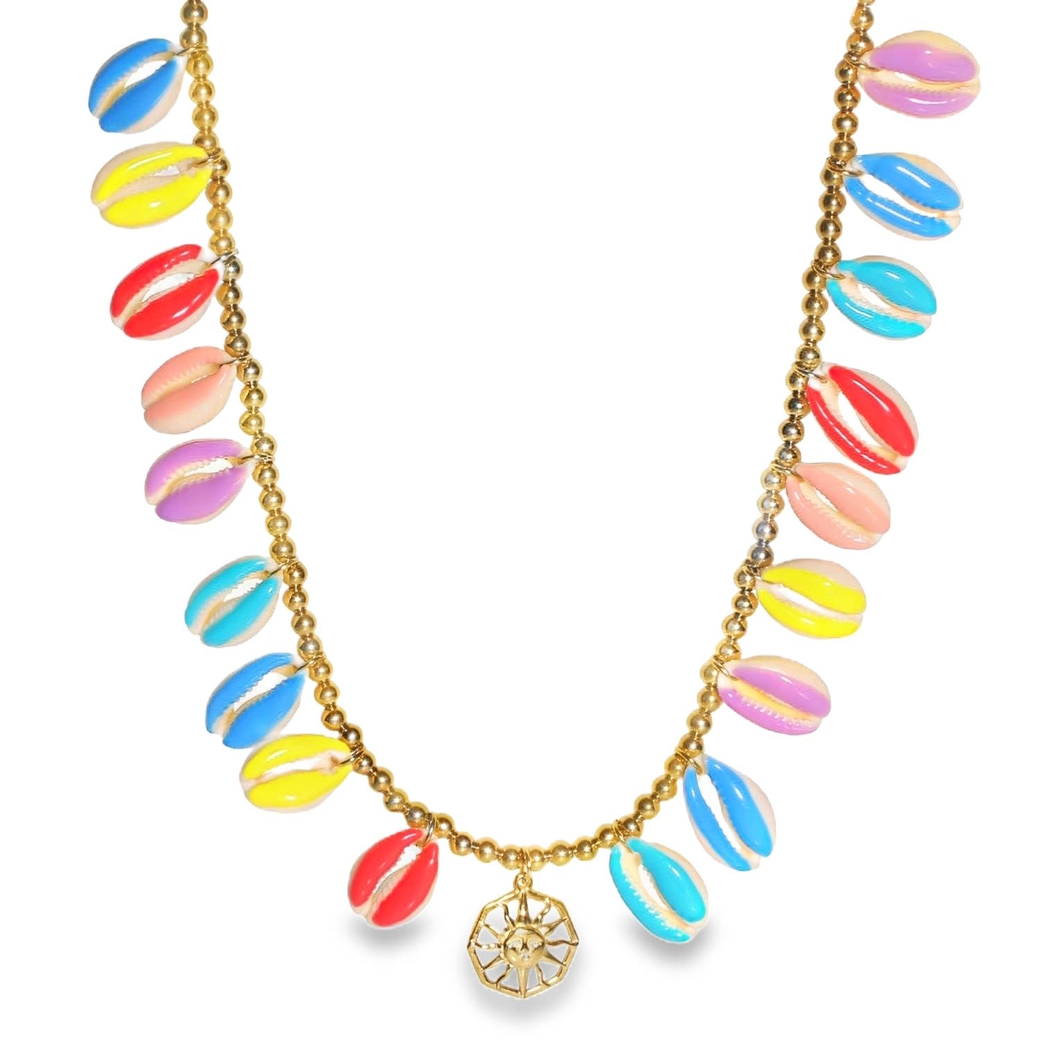 Une série de véritables cauris (coquillages) rythment le collier. Chaque coquillage est délicatement laqué de couleurs vives et contrastées (Bleu azur et turquoise, Jaune citron, Rouge corail, Rose poudré et violet lilas).