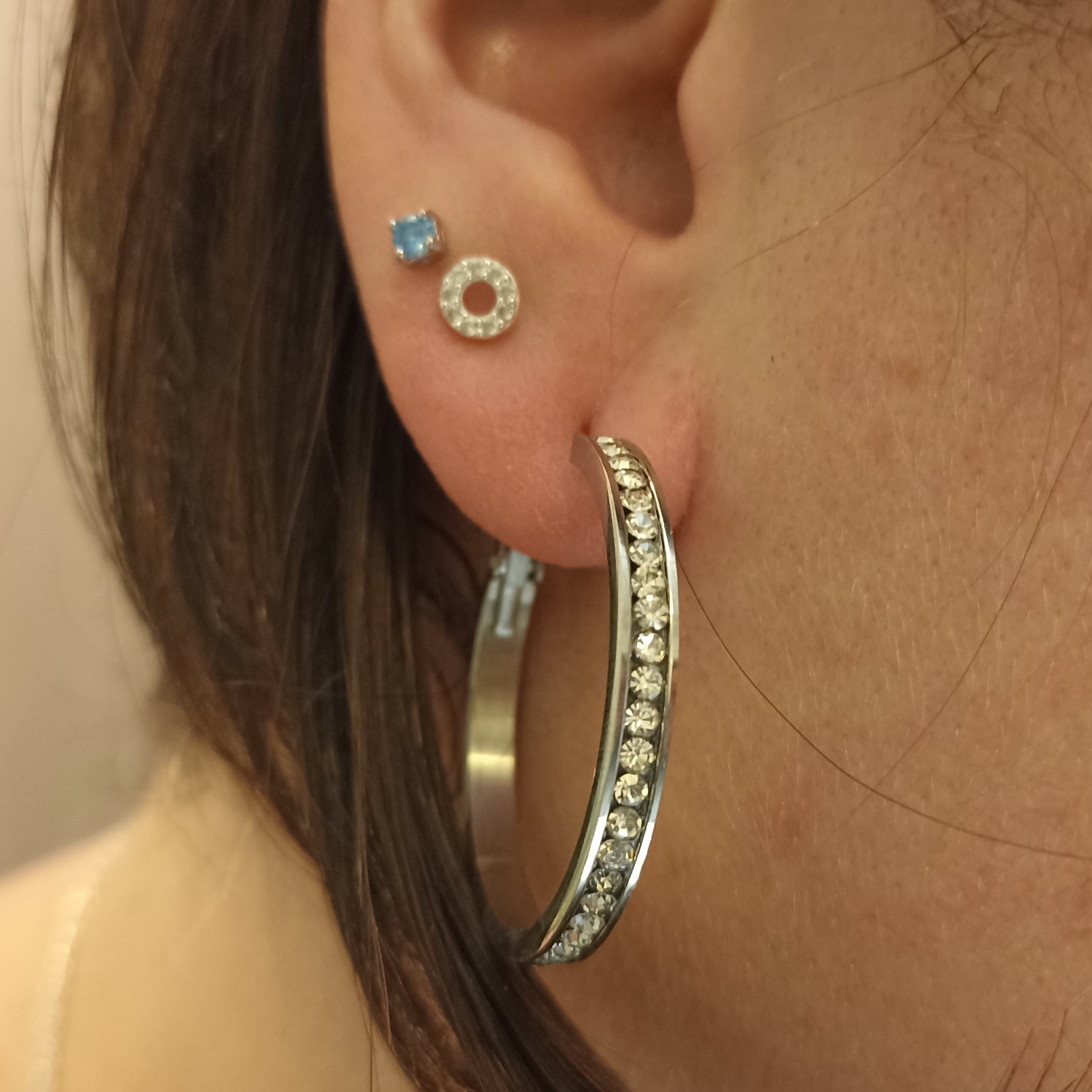 Boucles d'oreilles créoles en acier chirurgical 316L et cristaux synthétiques de couleur aurore boréale.