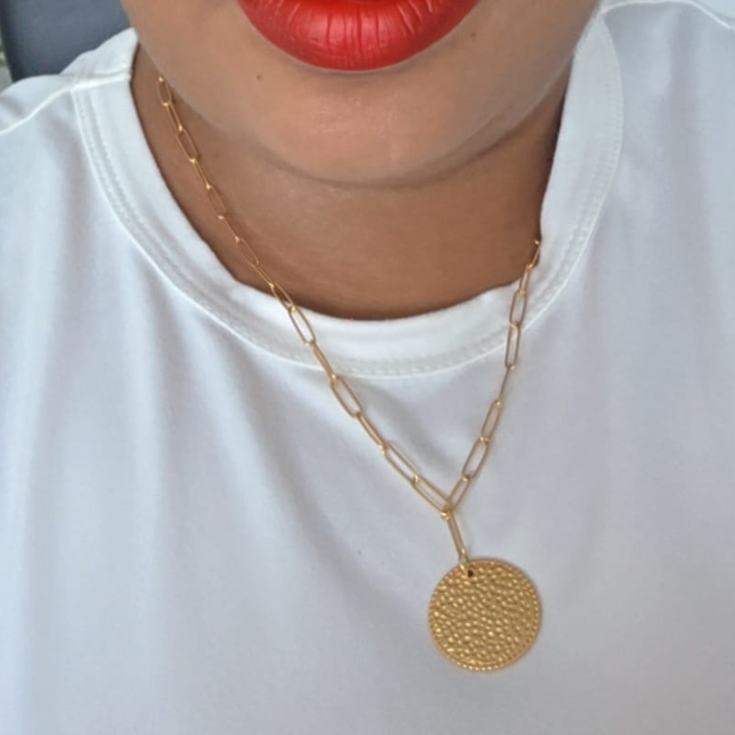 Description Collier composé d'une chaîne et d'un pendentif pastille ronde martelée en acier 316L doré. Fermoir mousqueton avec 5 cm de rallonge. Longueur 50+5 cm [Guide des tailles] Diamètre 22 mm Matière(s) Acier . L'acier utilisé dans la bijouterie existe sous plusieurs qualités. Nous utilisons principalement la qualité 316L, qualité qui est utilisée en chirurgie. Cet acier est donc inoxydable et reste très résistant. Fermoir Mousqueton Couleur(s) dominante(s) Doré Public Adolescent , Adulte . Genre Femme , Fille . Saison Indémodable . Cliquez sur une matière, un thème, une couleur ou une collection pour voir tous les articles associés.