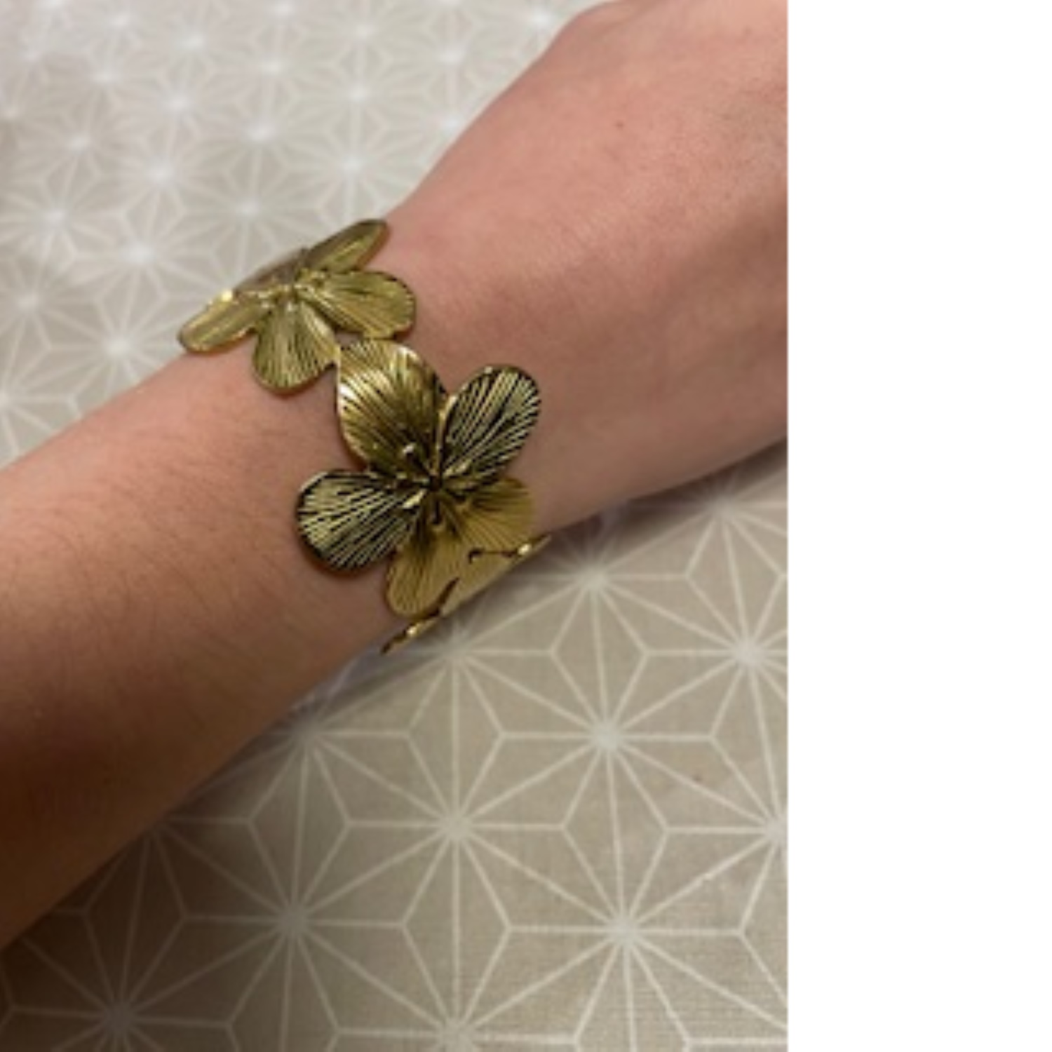 Description Bracelet manchette ouvert en forme de fleurs en acier doré. Largeur 32 mm Diamètre 58 mm [Guide des tailles] Matière(s) Acier . L'acier utilisé dans la bijouterie existe sous plusieurs qualités. Nous utilisons principalement la qualité 316L, qualité qui est utilisée en chirurgie. Cet acier est donc inoxydable et reste très résistant. Fermoir Aucun Couleur(s) dominante(s) Doré Public Adolescent , Adulte . Genre Femme , Fille . Saison Indémodable . Thème(s) Fleurs , Nature . Rayon en magasin TC7 Cliquez sur une matière, un thème, une couleur ou une collection pour voir tous les articles associés.