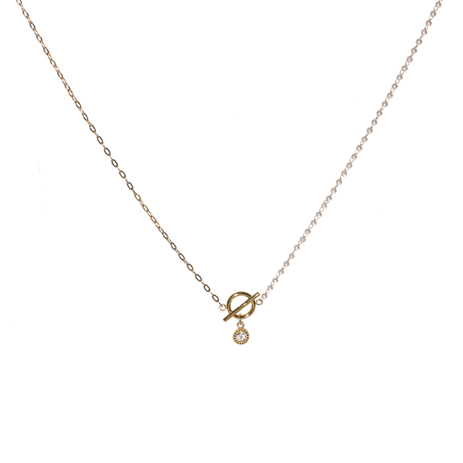 Description Collier composé d'une chaîne en acier doré, d'une chaîne de perles d'imitation, d'un cercle barré en acier doré et d'un pendentif rond serti d'un cristal. Fermoir mousqueton avec 5 cm de rallonge. Cliquez sur une matière, un thème, une couleur ou une collection pour voir tous les articles associés.