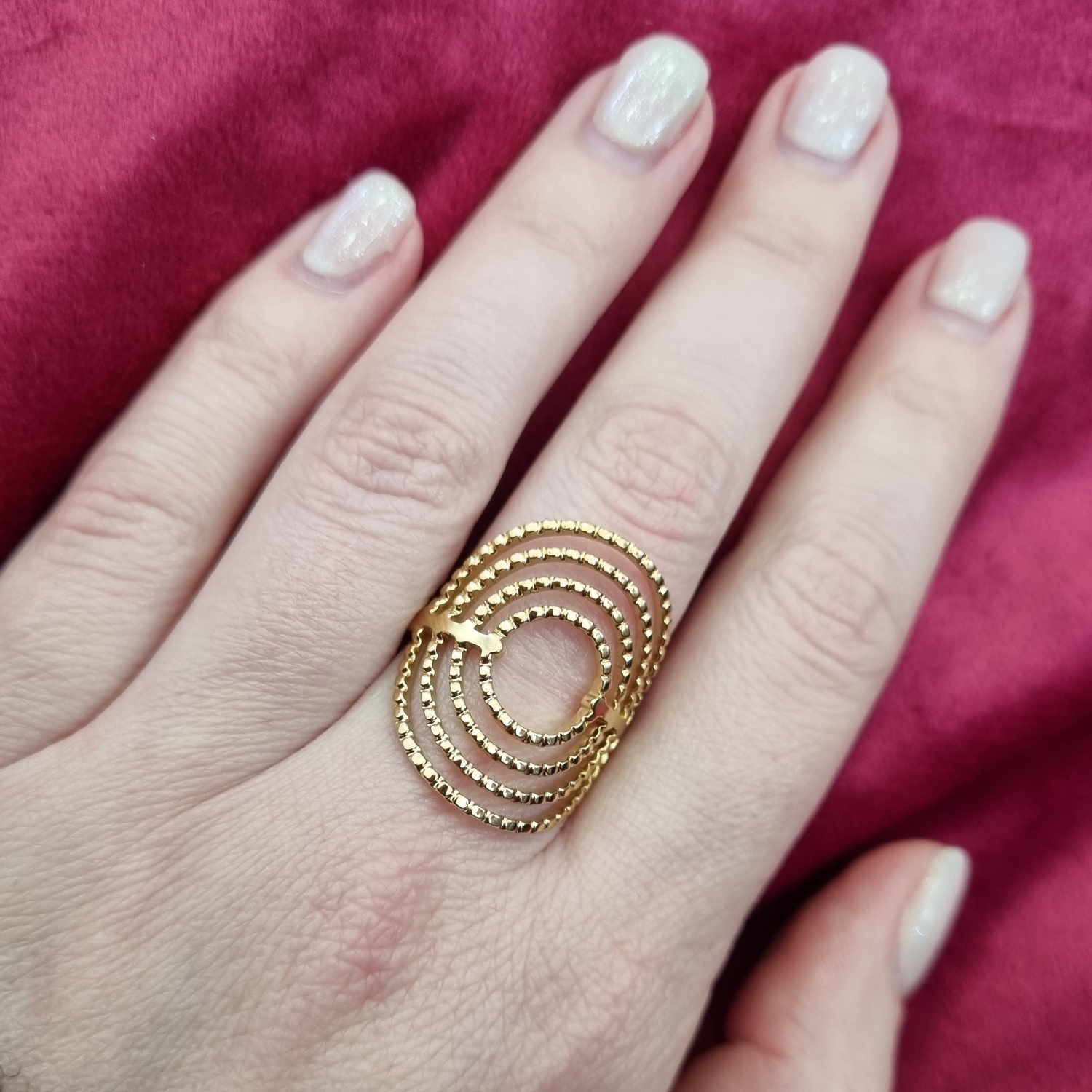 Description Bague de forme ovale composée de cercles en acier doré. Taille ajustable. Largeur 25 mm Matière(s) Acier . L'acier utilisé dans la bijouterie existe sous plusieurs qualités. Nous utilisons principalement la qualité 316L, qualité qui est utilisée en chirurgie. Cet acier est donc inoxydable et reste très résistant. Couleur(s) dominante(s) Doré Public Adolescent , Adulte . Genre Femme , Fille . Saison Indémodable . Cliquez sur une matière, un thème, une couleur ou une collection pour voir tous les articles associés.