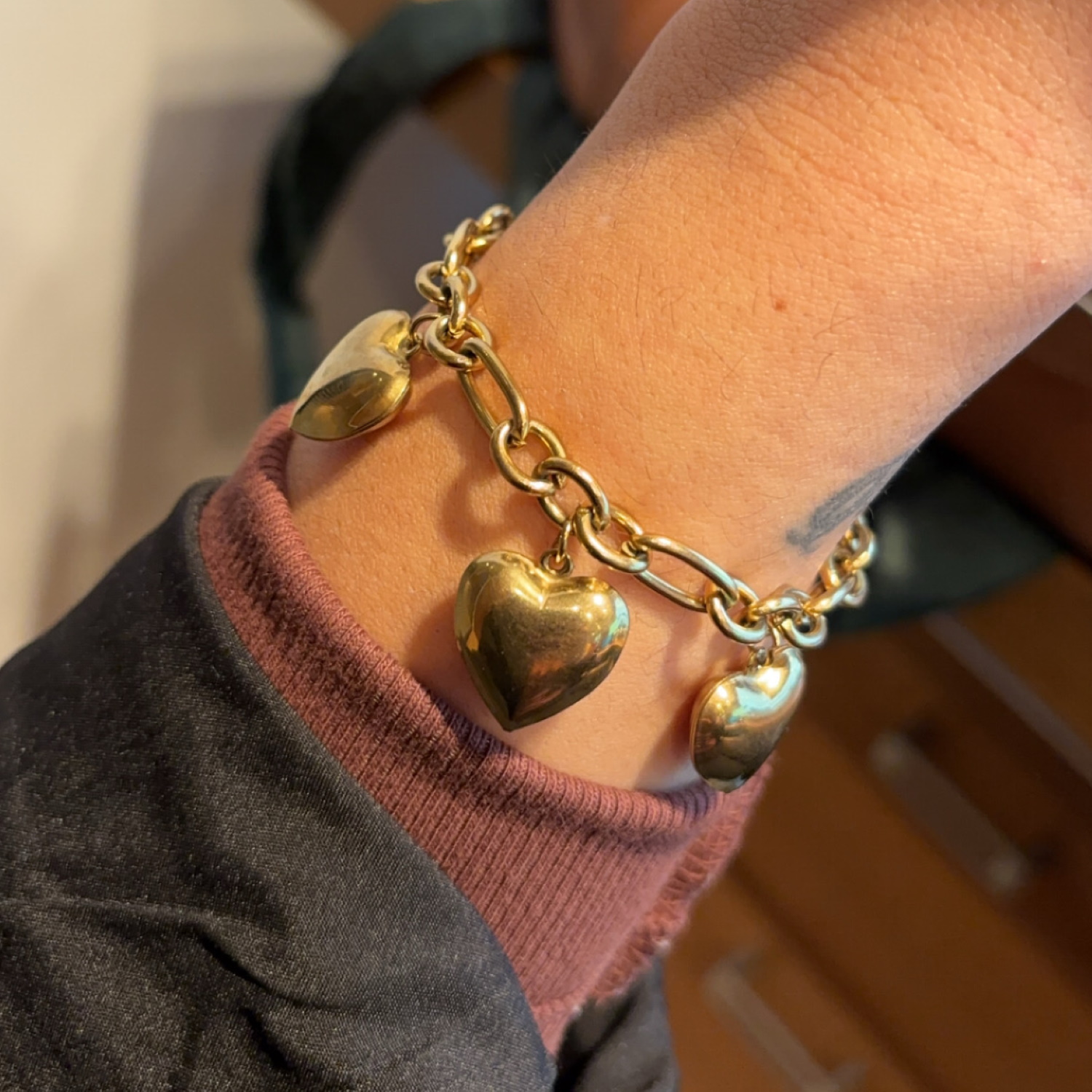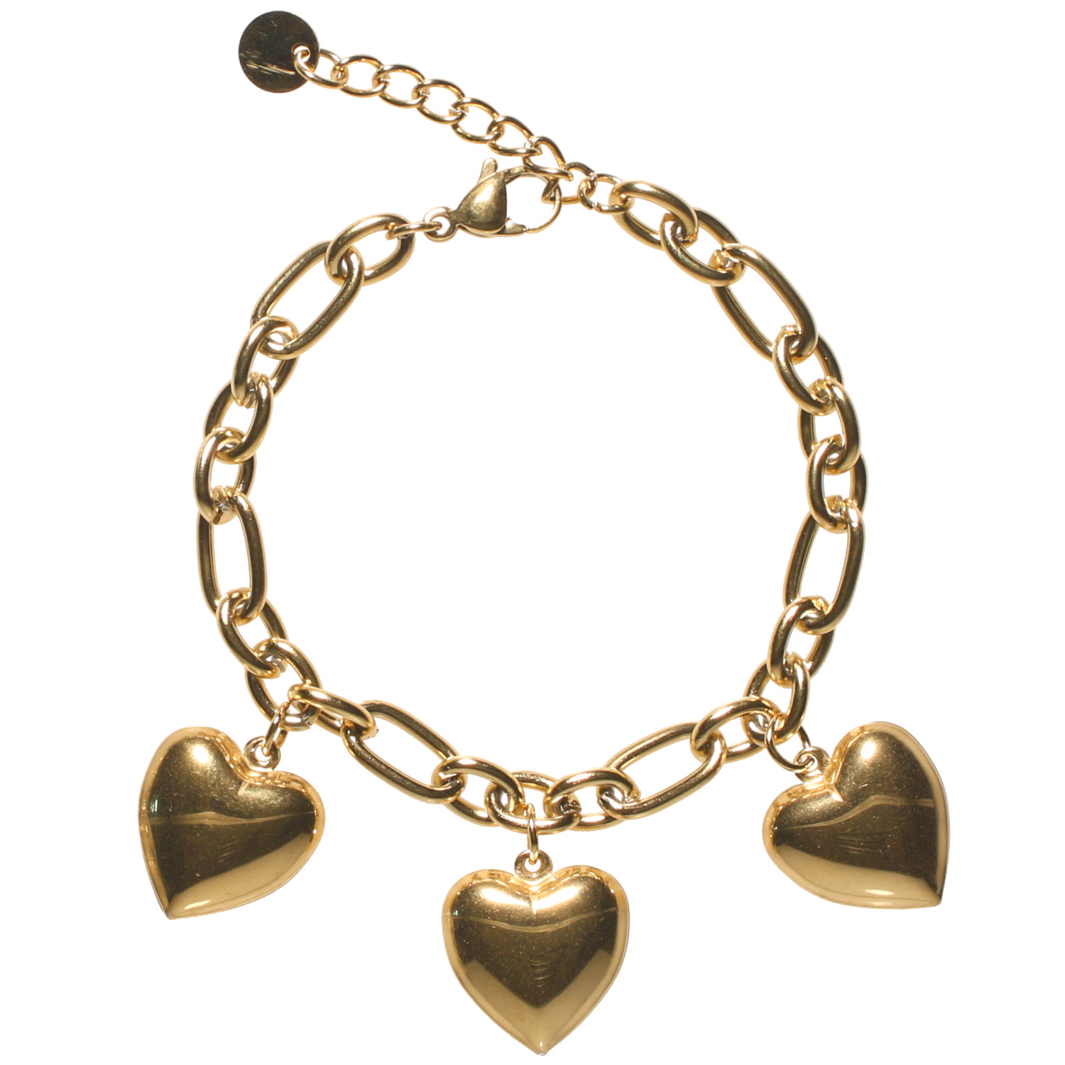 Description Bracelet composé d'une chaîne et de trois cœurs en acier doré. Fermoir mousqueton avec 2.5 cm de rallonge. Longueur 16+2.5 cm [Guide des tailles] Largeur 25 mm Matière(s) Acier . L'acier utilisé dans la bijouterie existe sous plusieurs qualités. Nous utilisons principalement la qualité 316L, qualité qui est utilisée en chirurgie. Cet acier est donc inoxydable et reste très résistant. Fermoir Mousqueton Couleur(s) dominante(s) Doré Public Adolescent , Adulte . Genre Femme , Fille . Saison Indémodable . Thème(s) Amour . Cliquez sur une matière, un thème, une couleur ou une collection pour voir tous les articles associés.