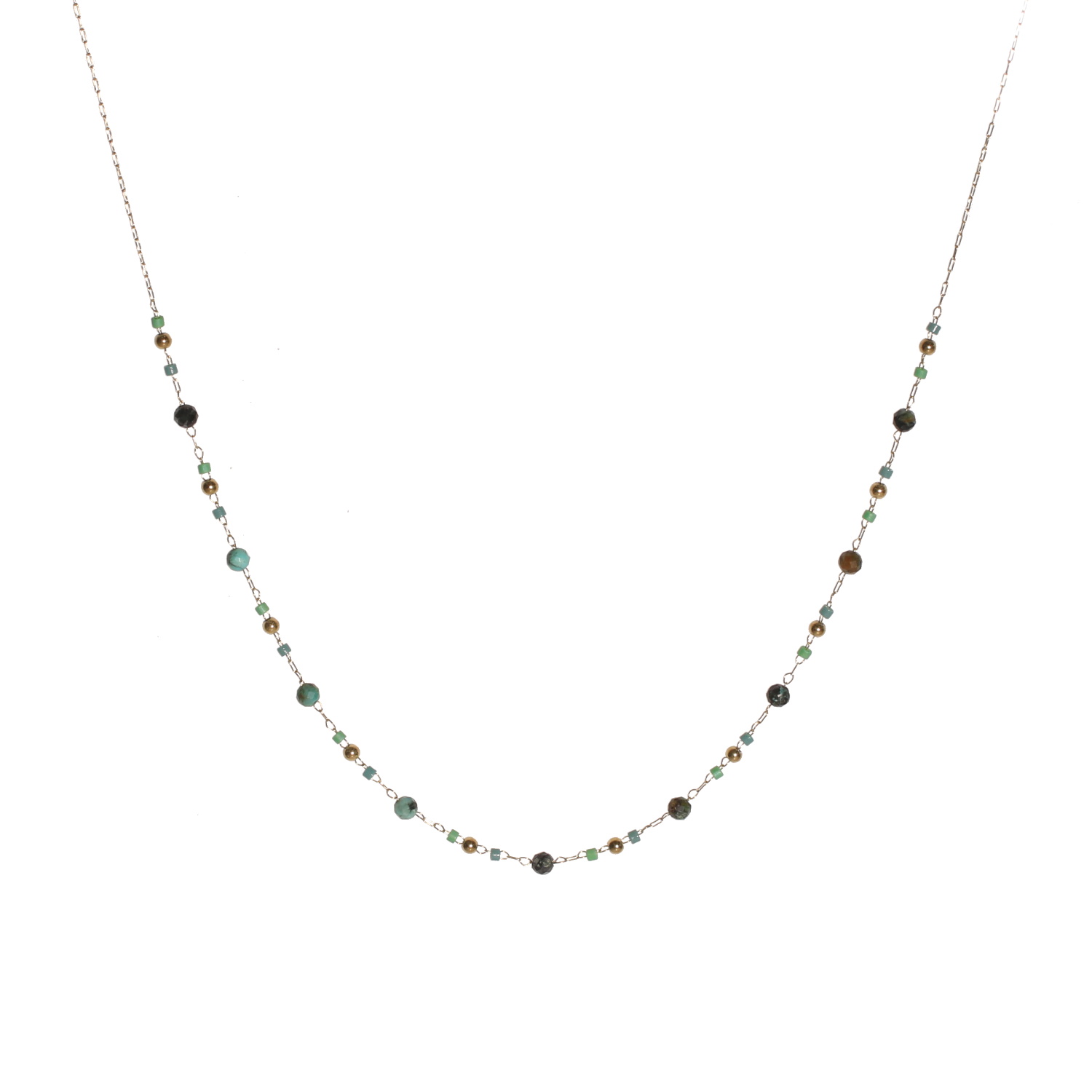 Description Collier composé d'une chaîne avec perles en acier doré, des perles cylindriques de couleur verte et des perles rondes de couleur verte. Fermoir mousqueton avec 5 cm de rallonge. Cliquez sur une matière, un thème, une couleur ou une collection pour voir tous les articles associés.
